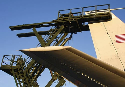 The Military Aircraft Systems is an all-in-one solution for efficient and safe military aircraft maintenance. Featuring durable steel construction, a self-propelled loading platform, adjustable upper-level platforms, integrated stairs, and removable handrails, it provides secure access to hard-to-reach areas without the need for heavy equipment. Includes tie-off points for fall arrest systems, ensuring operator safety.